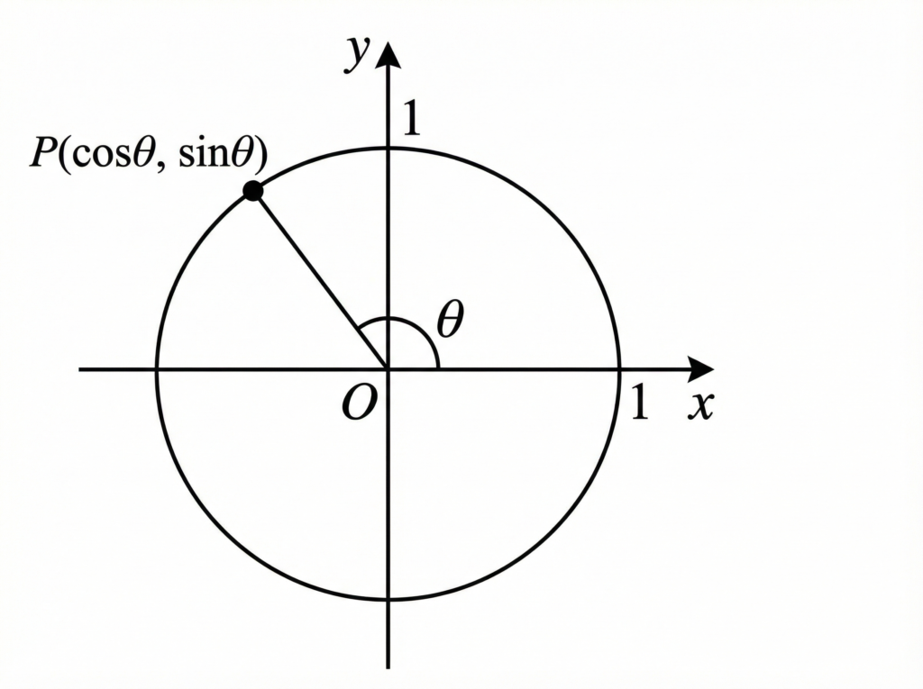 単位円上の点の $x$ 座標が $\cos\theta$ , $y$ 座標が $\sin\theta$ , 直線 $\text{OP}$ の傾きが $\tan\theta$ となります。
