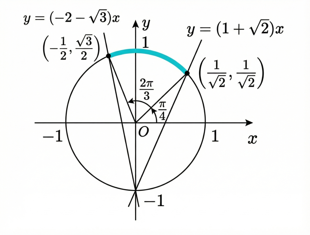 (4)合成を用いて解こうとするとめんどくさいことになります。(3)と同様に定義から考えます。単位円と $y+ax=-1$ の交点の座標 $(\cos\theta,\sin\theta)$ が方程式を満たす。交点が下図の青線部上に存在するとき、方程式の解は $ \frac{\pi}{4} \leqq \theta \leqq \frac{2}{3}\pi $ に存在する。